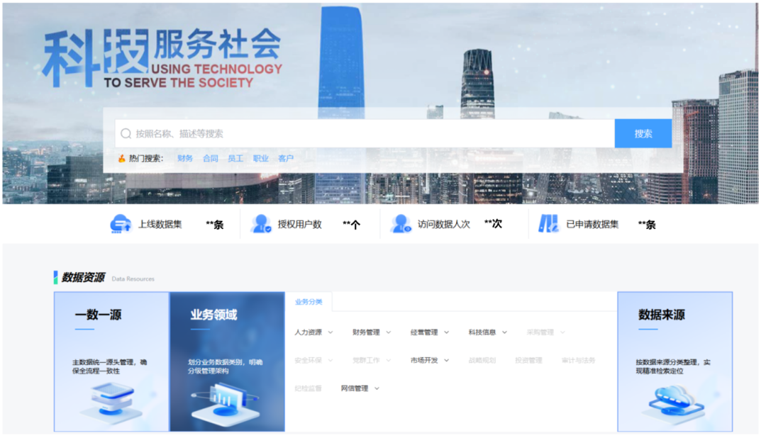 聚焦人资、财务、经管、科技等核心业务领域,构建“一数一源”管理机制,形成标准规范的数据资源体系,搭建以数据目录为核心的统一服务门户,实现全级次数据资源的集中纳管、规范治理与安全共享,提升数据资源治理与应用效能。