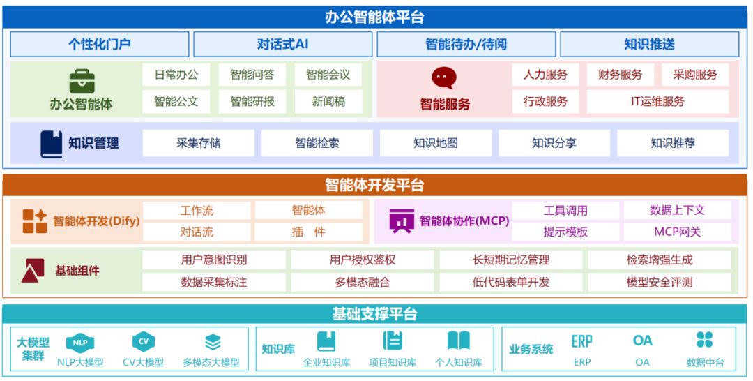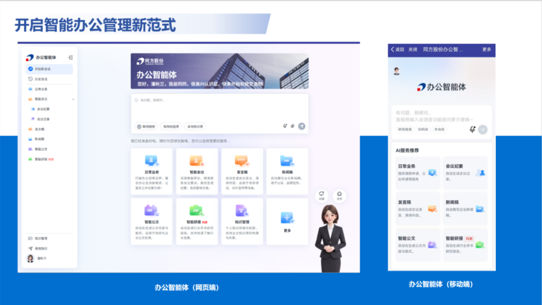 基于大模型技术构建企业级智能辅助系统,提供智能问答、会议纪要生成、公文拟稿、研报分析、日常业务智能体等场景化服务,全面提效日常办公。